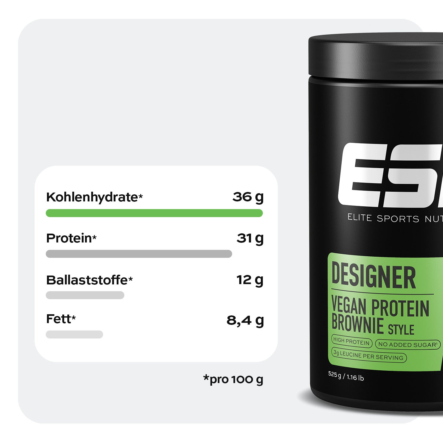 • 23 g Protein, 3 g Leucin & 8,9 g Ballaststoffe pro Portion4