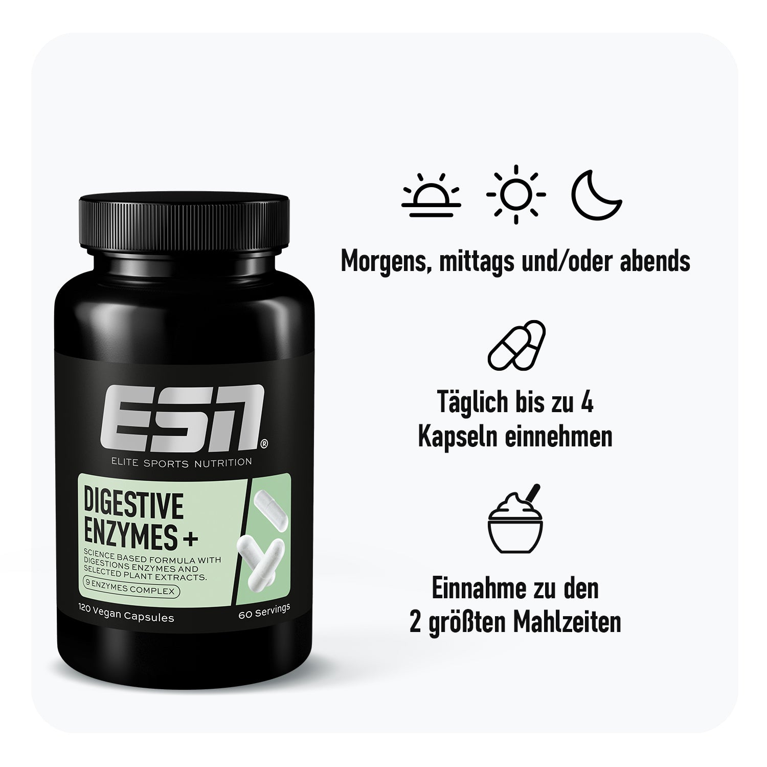 Make every bite count – mit unseren Digestive Enzymes +. Der Komplex aus 9 Enzymen, ausgewählten Pflanzenextrakten und weiteren Inhaltsstoffen supportet deinen Körper effektiv dabei, die Nahrung in ihre Grundbestandteile aufzuspalten, die dein Körper dann effizient verwerten kann. Ideal, um das Maximum aus deinen Meals herauszuholen.123