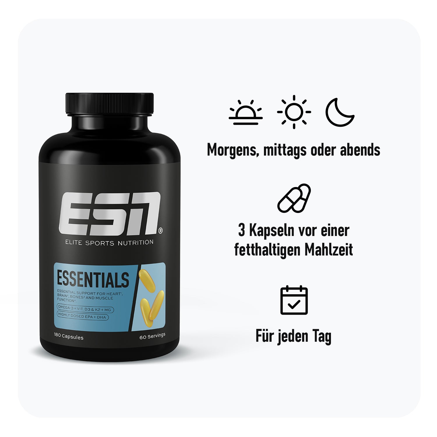 Wir haben die vier essentiellen Nährstoffe Omega-3, Vitamin D3, Vitamin K2 und Magnesium in einem Produkt vereint, damit du deinen Körper ideal versorgen und so die gesundheitliche Basis für eine optimale Performance und Regeneration schaffen kannst: Mit den ESN Essentials unterstützt du dein Herz1, dein Gehirn2, deine Muskeln3 und deine Knochen.4 Mit den ESN Essentials brauchst du dir keine Gedanken um Dosierungen, Kombinationen und Co. zu machen, denn wir haben die Wirkstoffe für dich optimal aufeinander abgestimmt. Get your essential support!