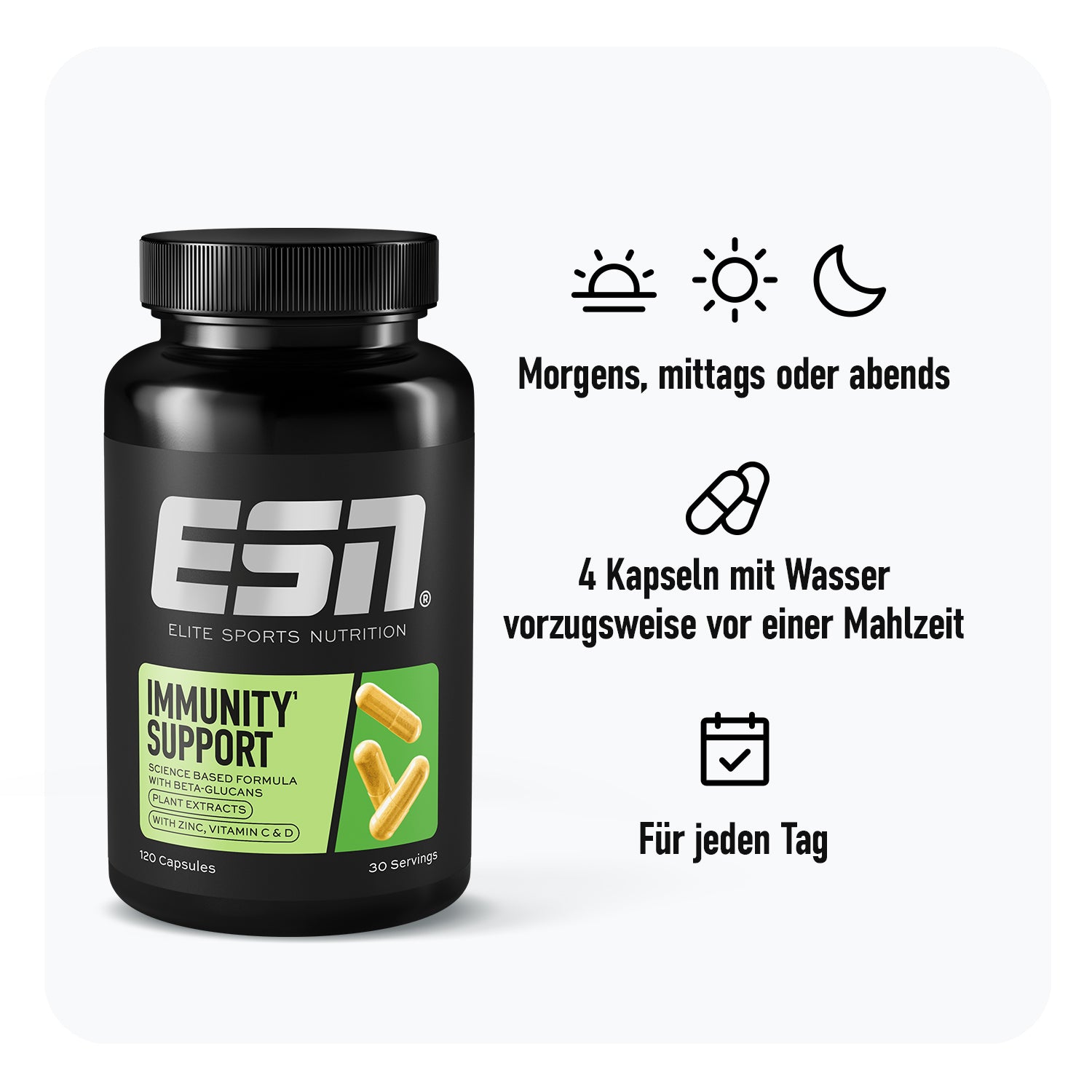 Maximize your immunity1, minimize your breaks – mit unserem Immunity1 Support. Die neue Formel unserer Immun-Kapseln mit Beta-Glucanen, Pflanzenextrakten und Mikronährstoffen bietet dir den optimalen Support für dein Immunsystem – temporär präventiv und akut.1 Ideal, um Trainingsausfälle und Progress-Verluste zu verringern.1