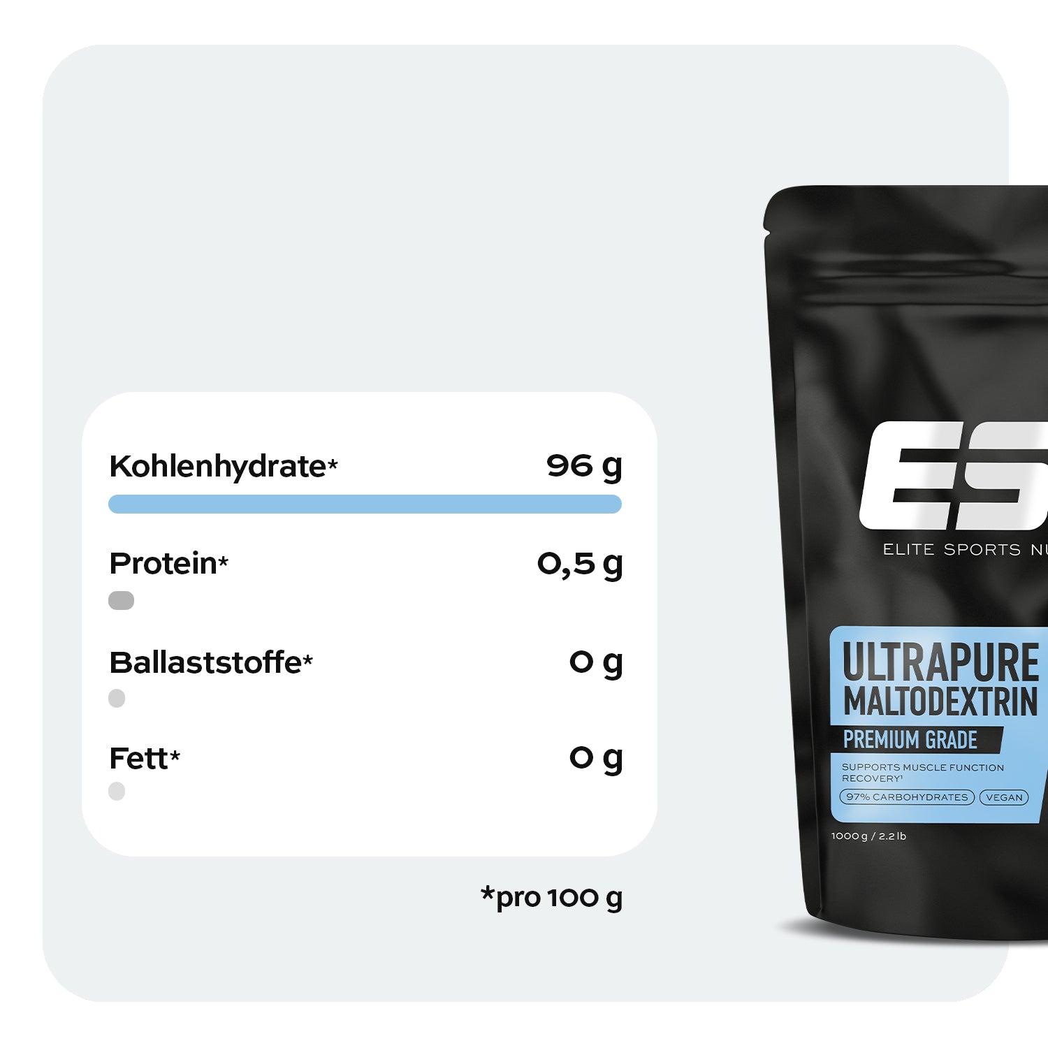 1 Die Kohlenhydrate des ESN Maltodextrin unterstützen die Regeneration der Glykogenvorräte und Muskulatur, die durch intensive und lange Workouts erschöpft wurden. Die optimale Wirkung erreicht man durch die Aufnahme von insgesamt 4 g Kohlenhydraten pro kg Körpergewicht. Die Gesamtmenge an Kohlenhydraten kann neben dem ESN Maltodextrin aus weiteren Quellen, wie z. B. dem Rice Pudding, stammen und sollte in mehreren Dosen innerhalb der ersten 4 Stunden und bis spätestens 6 Stunden nach dem Workout zugeführt werden.