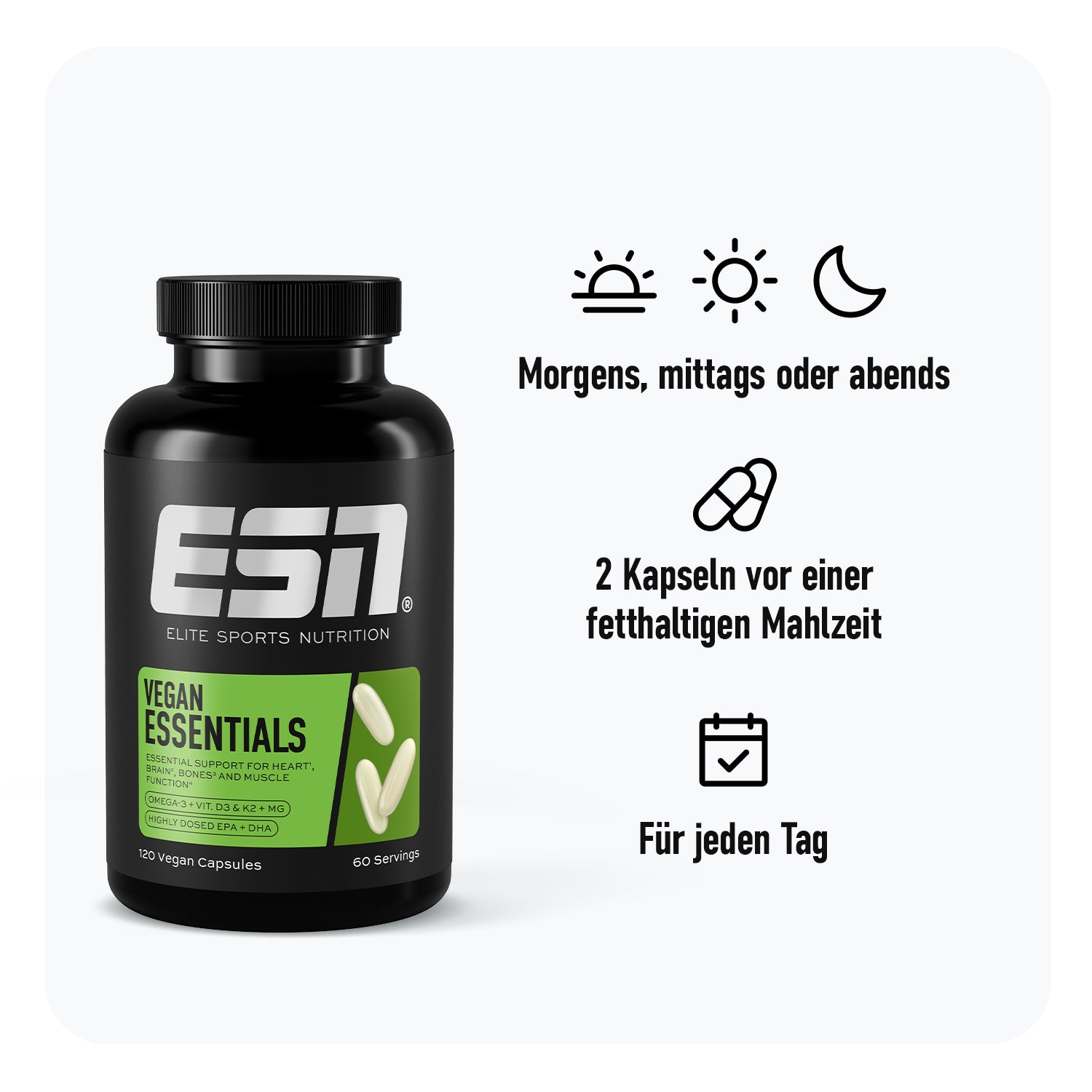 Get vegan essential support: In unseren Vegan Essentials kombinieren wir die vier essentiellen Nährstoffe Omega-3 aus Algenöl, Vitamin D3, Vitamin K2 und Magnesium in einem Produkt, damit du gleichzeitig dein Herz, dein Gehirn, deine Muskeln und deine Knochen unterstützen kannst. 1 2 3 4 Diese vegane 4-in-1 Nährstoffkombi ist der perfekte Support für alle, die ihren Körper optimal versorgen und die gesundheitliche Basis für ihre maximale Performance und Regeneration schaffen wollen.