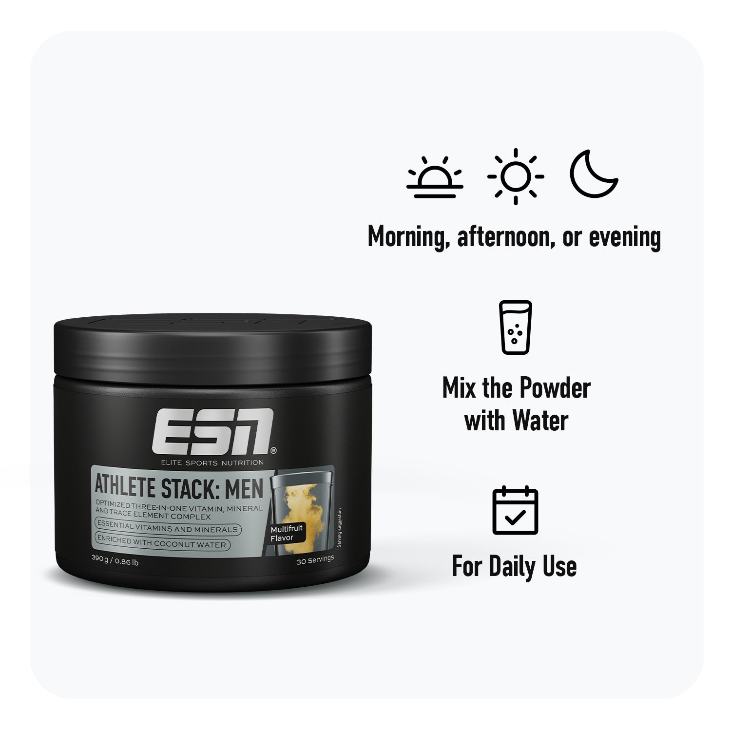 Vitamins and Minerals Mixture 58% (Coconut Water Powder, Magnesium Citrate, Calcium Acetate, Taurine, Potassium Citrate, Glycine, Vitamin E (MixedTocopherols), Vitamin C (Ascorbic Acid), Zinc Gluconate, Ferrous Bisglycinate, Niacin (Nicotinamide), Folic Acid (Pteroyl Monoglutamic Acid), Pantothenic Acid (Calcium-D-Panthothenate), Sodium Selenite, Vitamin D (D3/Cholecalciferol),Manganese Bisglycinate, Biotin (D-Biotin), Vitamin B6 (Pyridoxine Hydrochloride), Chromium Picolinate, Thiamine (Thiamine Mononitrate), Riboflavin (Vitamin B2), Vitamin K (K2/Menaquinone-7), Vitamin A (Retinyl Acetate), Copper Bisglycinate, Vitamin A (Beta Carotene), Potassium Iodide, Vitamin B12 (Methylcobalamin, Adenosylcobalamin, Hydroxocobalamin)), L-Glycine, Acids (Citric Acid), Flavoring, Anti-Caking Agents (Silicon Dioxide), Sweeteners (Sucralose, Acesulfame K), Colors(Carotenes).Key Facts – Athlete Stack Men Powder