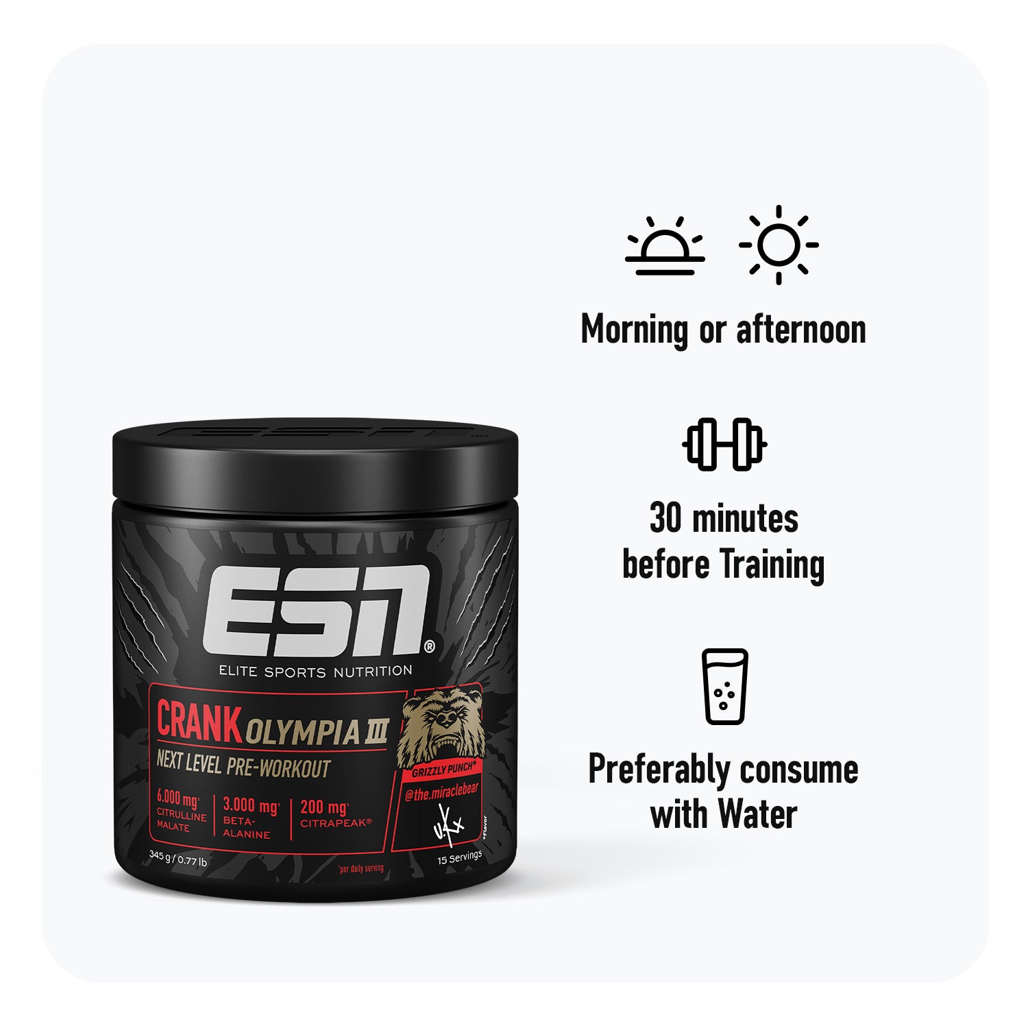 Crank Olympia III is the next-level version of our popular Olympia Booster. With CitraPeak® – exclusive to ESN – plus added synephrine and niacin for maximum energy and top performance.6