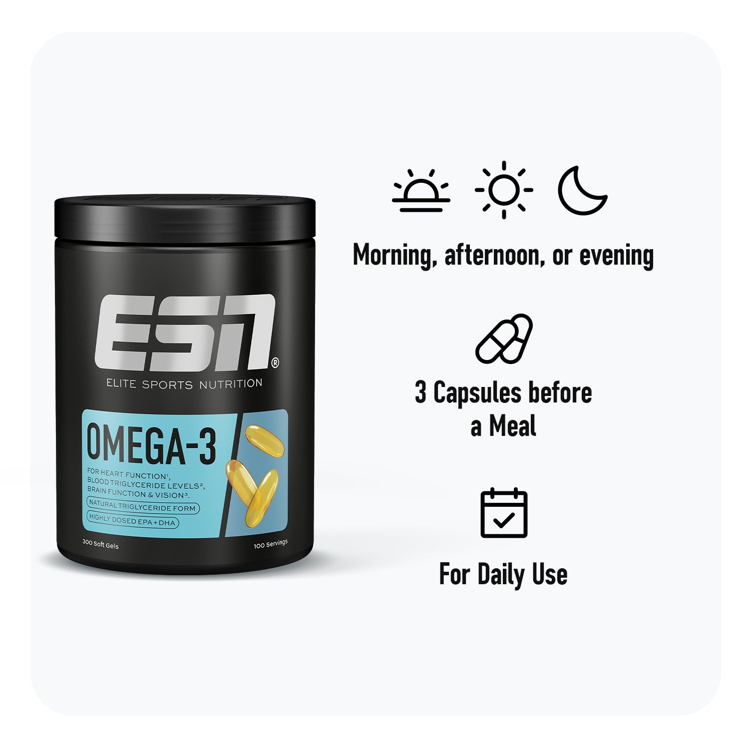 Omega-3 fatty acids are the ideal support for all athletes, because EPA and DHA have been proven to make an essential contribution to the functioning of the cardiovascular system and the brain, and help maintain normal blood pressure and normal triglyceride concentrations in the blood.1,2 And as an athlete, you can only benefit from this: the proven positive effects are the basis for your performance and regeneration, you can build muscle more effectively and make full use of your endurance potential.
