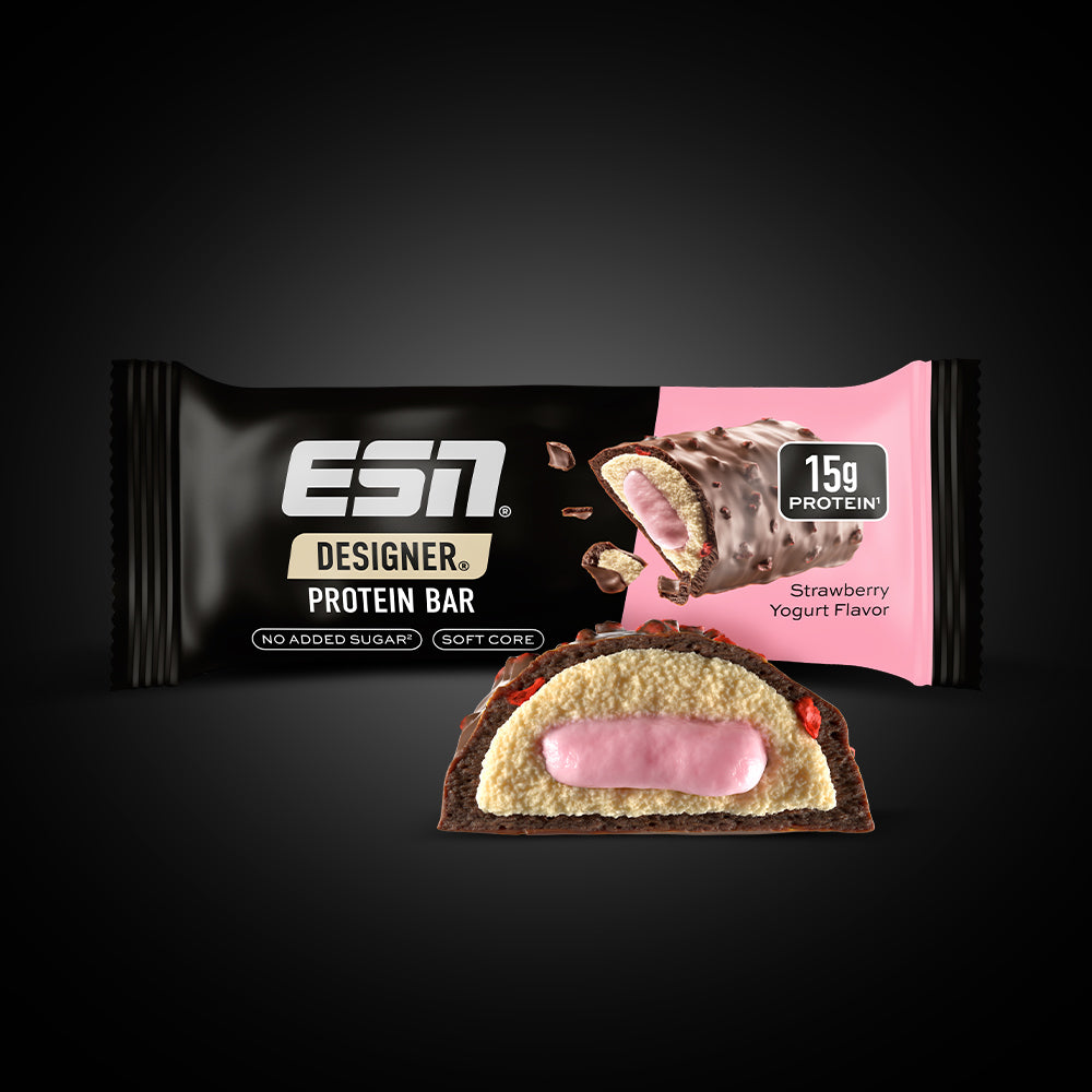 "Wenn’s mal schnell gehen muss, unterwegs oder ich einfach Bock auf was Süßes hab, greif ich zu meinen Lieblingsriegeln. Egal ob Designer Bar Strawberry Yogurt, Dark Cookie White Choc oder White Choc Pistachio."