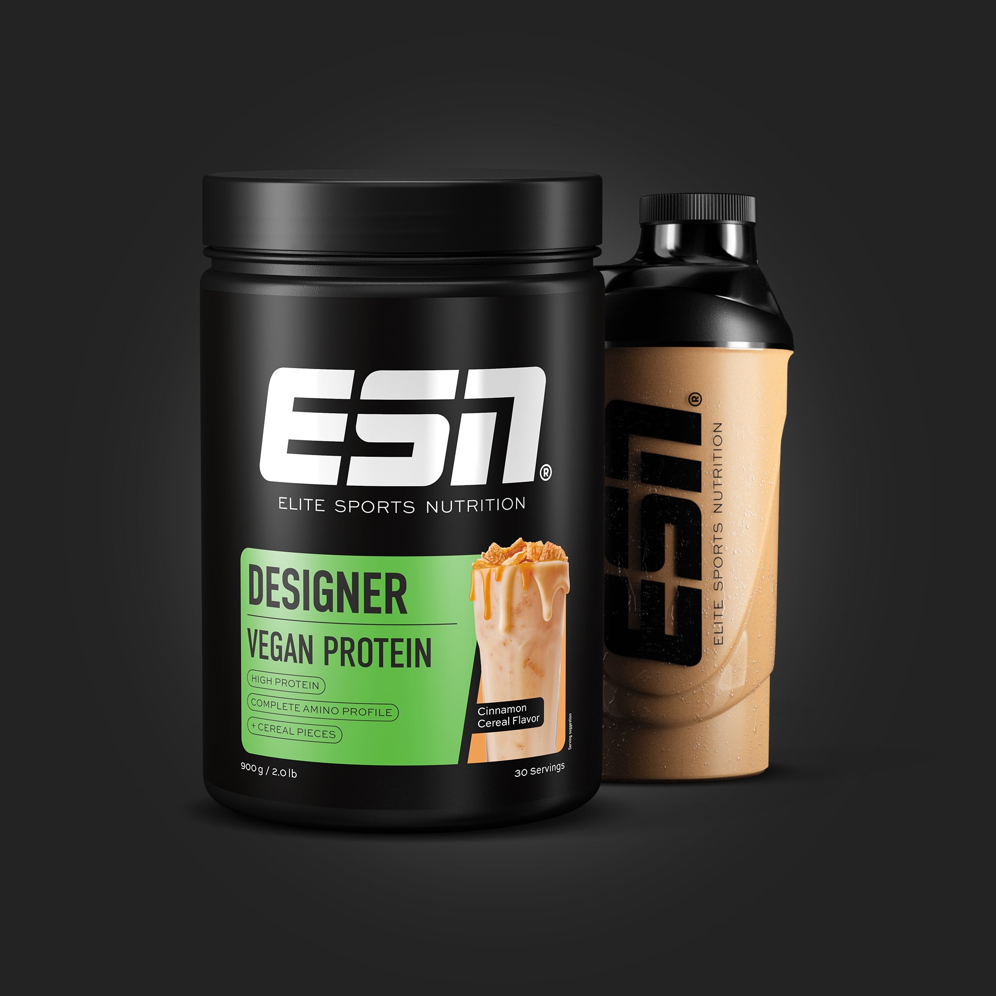Proteine di soia 81 %, L-leucina 10 %, aroma, pezzi di cereali 4 % (farina di grano integrale, farina di riso, zucchero, olio di palma, destrosio, amido di mais, destrina, cannella, crusca di frumento, sale, farina di orzo maltato), edulcoranti (sucralosa, glicosidi steviolici da stevia). Ingredienti di origine: UE/Non UE.Key Facts – Vegan Designer Protein