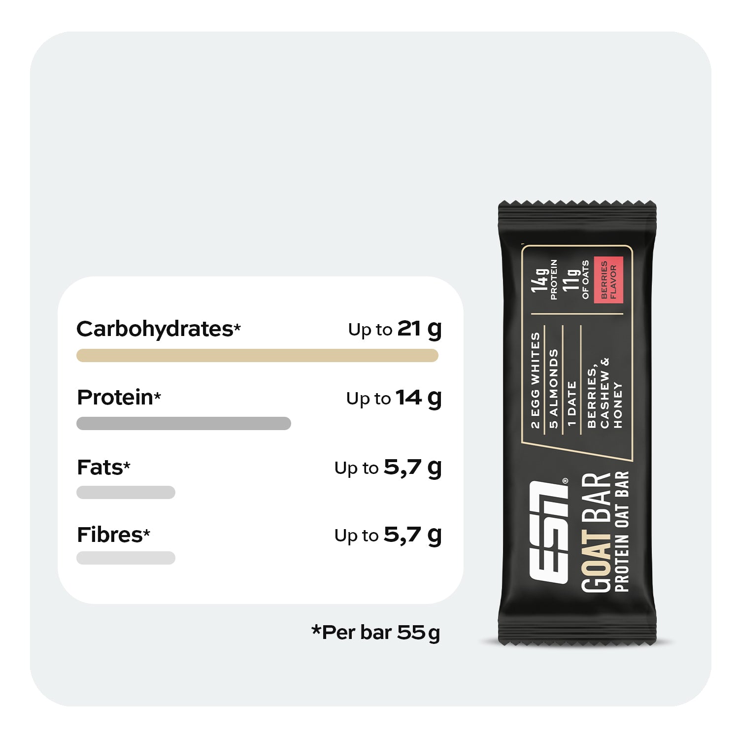 La nostra GOAT Bar ti offre ingredienti autentici, 14g di proteine dell’albume di alta qualità, energia completa da avena, frutta secca e frutta – senza riempitivi, dolcificata naturalmente con datteri e miele.
