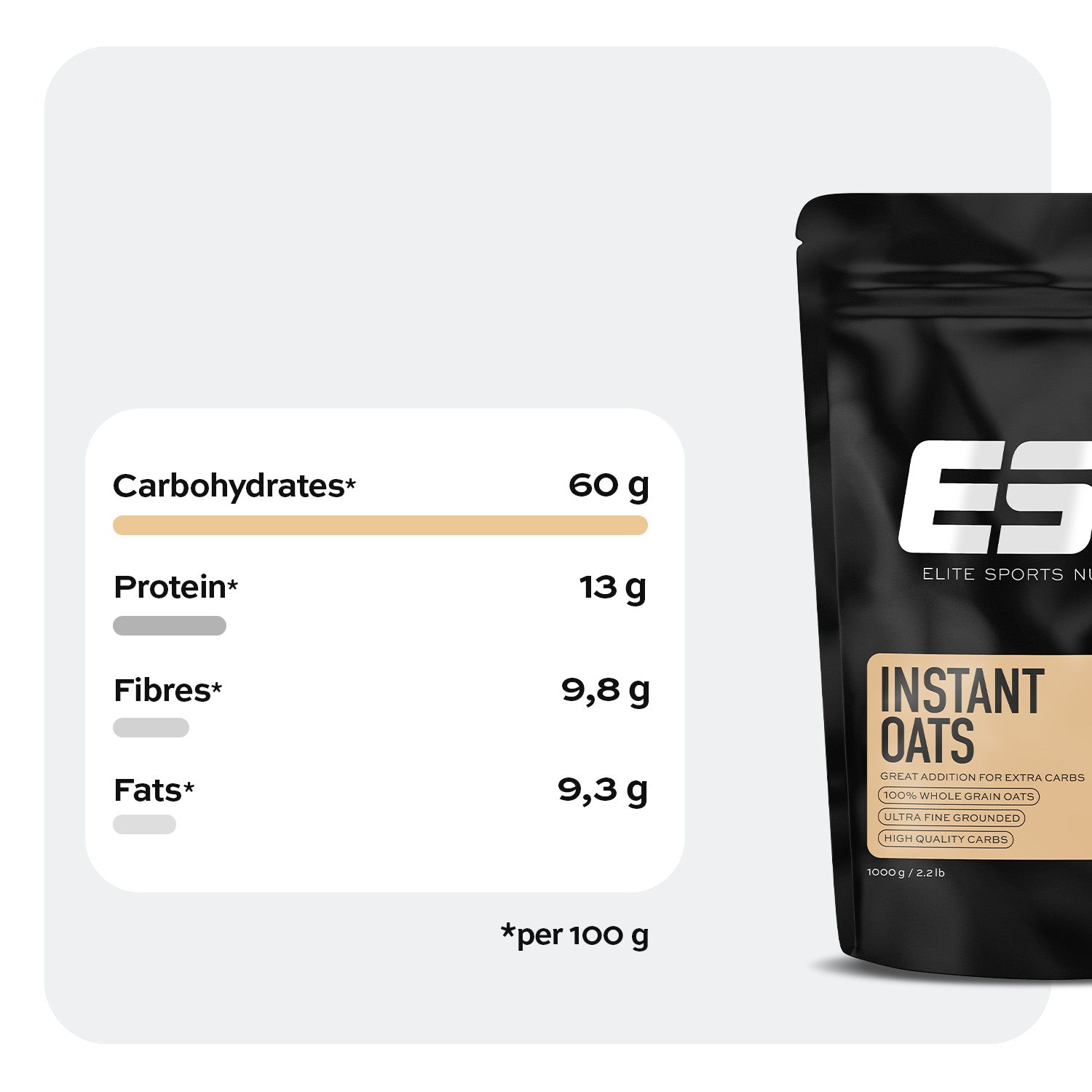 Potenza dei carboidrati istantanei - la nostra avena istantanea vi fornisce in pochi secondi carboidrati complessi, proteine preziose e fibre di alta qualità, che sostengono i vostri muscoli e il vostro recupero e vi forniscono una rapida energia.1,2