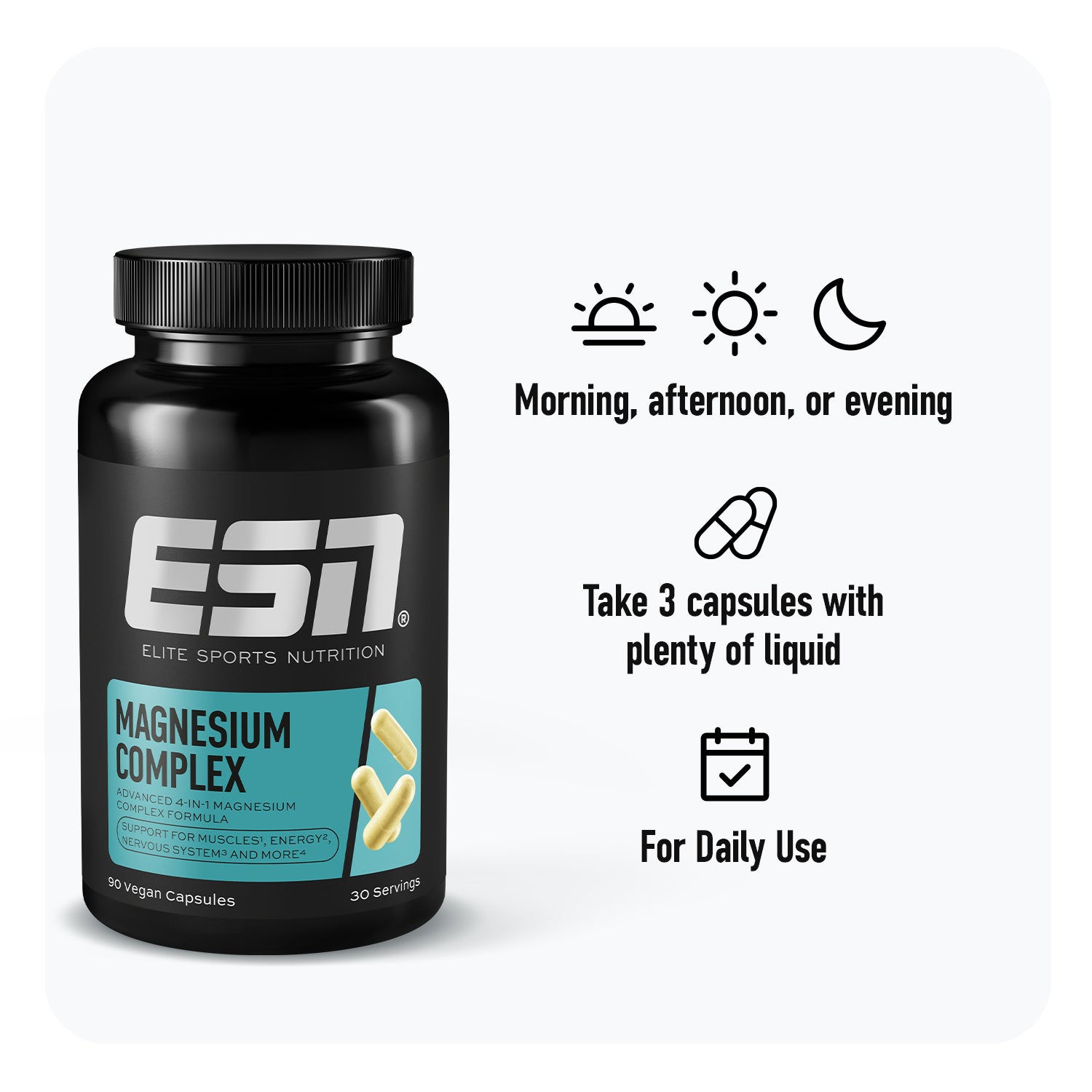 Un nuovo livello di magnesio – il nostro Magnesium Complex. La nostra formula innovativa combina 4 forme di magnesio di alta qualità e ti fornisce il supporto ottimale per la funzione muscolare, l’energia, il metabolismo e molto altro.1 La base ideale per massime prestazioni e un recupero più rapido.1